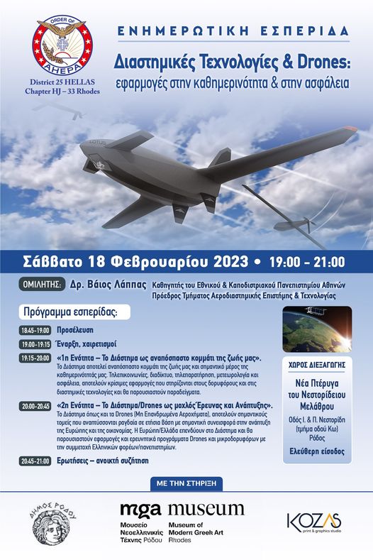 Το Μουσείο Νεοελληνικής Τέχνης Ρόδου σας προσκαλεί στην ανοικτή για το κοινό ενημερωτική εκδήλωση που διοργανώνεται από το Τμήμα AHEPA HJ-33 Ρόδου με θέμα «Διαστημικές Τεχνολογίες & Drones: εφαρμογές στην καθημερινότητα & στην ασφάλεια»